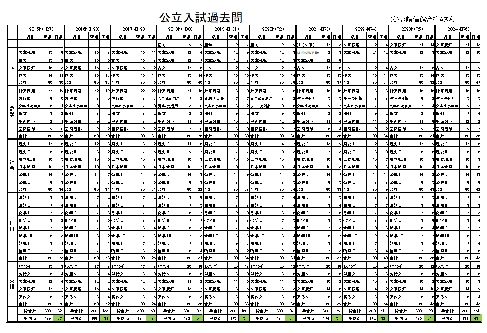 下記のようにAさんは、見事に成績をあげて志望校(講倫館)合格しました。